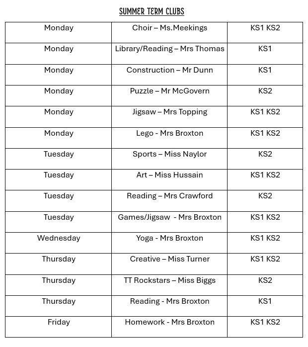 After school clubs are delivered by school staff from 3.15-4pm each evening. Each term we ask that children select from a variety of options - from sports clubs to mindfulness. School club letters will be sent out termly for children to select their preferences and children will be allocated a place on a first come first serve basis.